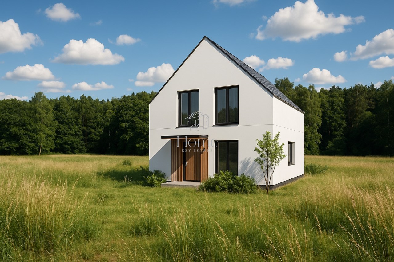 Na wizualizacjach prezentujemy przykładowy projekt domu jednorodzinnego o powierzchni użytkowej 99,70 m², który możemy zrealizować na tej działce. Budowa domu w proponowanej technologii trwa jedynie 100 dni od momentu uzyskania wszystkich niezbędnych pozwoleń.