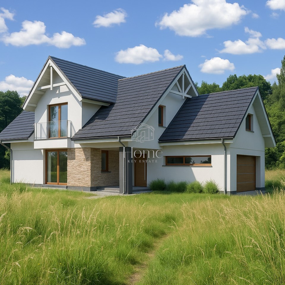 Na wizualizacjach prezentujemy przykładowy projekt domu jednorodzinnego o powierzchni użytkowej 146,70 m², który możemy zrealizować na tej działce. Budowa domu w proponowanej technologii trwa jedynie 100 dni od momentu uzyskania wszystkich niezbędnych pozwoleń.